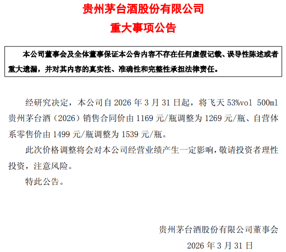 3月30日晚,贵州茅台公告,经研究决定,公司自2026年3月31日起,将飞天53% vol 500ml贵州茅台酒(2026)销售合同价由1169元/瓶调整为1269元/瓶、自营体系零售价由1499元/瓶调整为1539元/瓶。